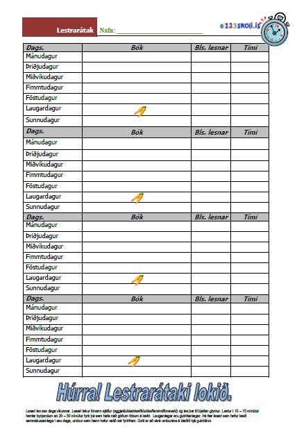 Einfalt tímaskráningarblað. Nemandi tekur sjálfur tímann við lesturinn og er umbunað fyrir samviskusemi.